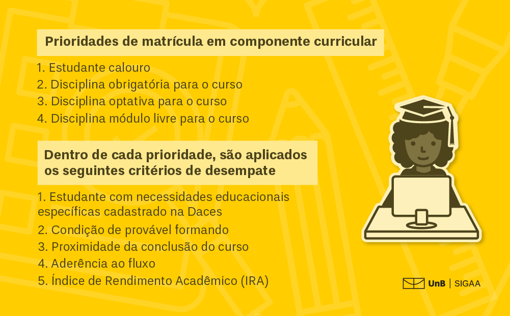 Durante as etapas de matrícula e rematrícula, não há necessidade de pressa. O processamento é coletivo e a ordem de solicitação não influencia a prioridade. Portanto, façam suas escolhas com calma e atenção.
