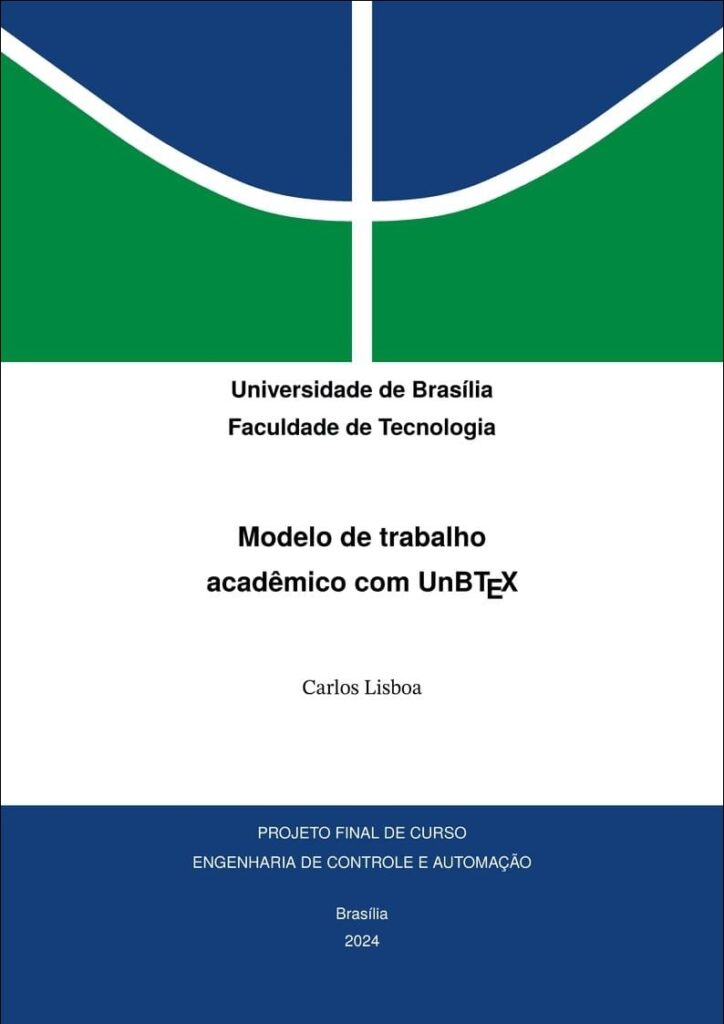 - Configure os comandos no arquivo *.tex principal do template da seguinte forma: \tipotrabalho{Projeto Final de Curso}; \tipocurso{Engenharia de Controle e Automação}; \preambulo{Projeto Final de Curso submetido como requisito parcial para obtenção do grau de Engenheiro de Controle e Automação.}; \publicacao{}; \instituicao[Universidade de Brasília]{Faculdade de Tecnologia}{}.